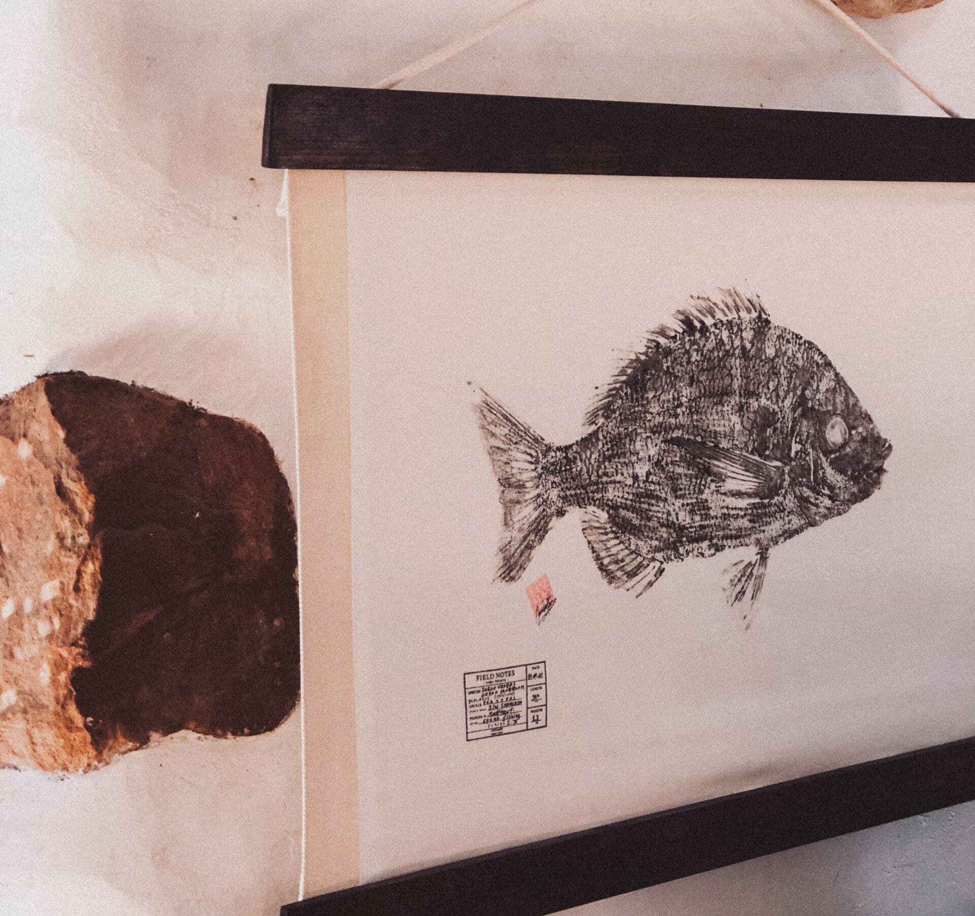 To create the prints, she applies black ink (usually squid ink) to the fish and transfers the resulting image onto 100% cotton fabric. Each fish series are limited to a maximum of five art pieces and the resources used are consciously selected, including the origin of the fish, which are captured using traditional, local methods such as spearfishing. To ensure nothing goes to waste, the fish can still be eaten afterwards.