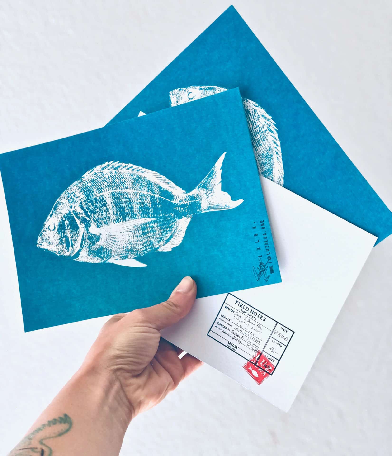 Another method Daniela uses for the fish prints is Cyanotype, which is a chemical process using two solutions – potassium ferricyanide and ferric ammonium – and a little help from the sun. Discovered in 1842, this process was quite popular up to the 20th century as an inexpensive method for reproducing photographs or documents and for making impressions of biological specimens in the field. Essentially, by exposing the mixture to sunlight, it turns into a stunning cyan blue colour, which makes for striking prints.