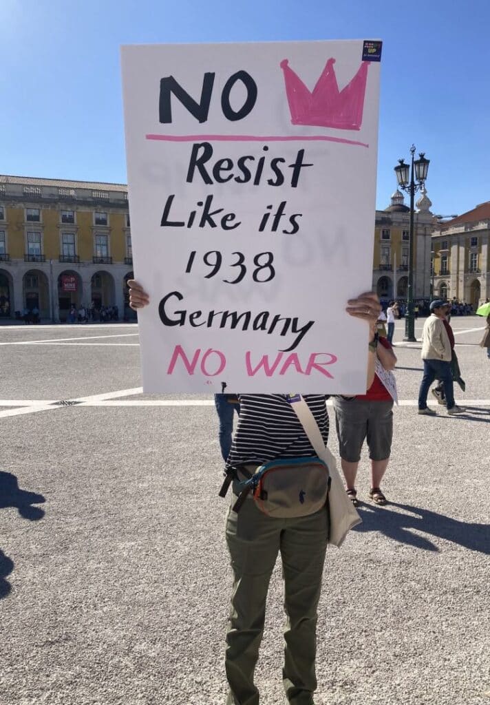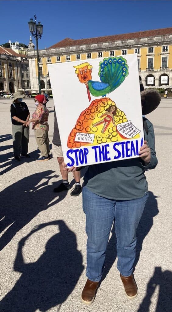 The demonstration, which drew around 900 Americans, had been organised weeks before by the group ‘Americans in Portugal United in Protest’ (‘For a Sane Pro-Democratic America’) and they shared the space at Lisbon’s Praça do Comércio with a music group from Cape Verde and some university fado singers.
