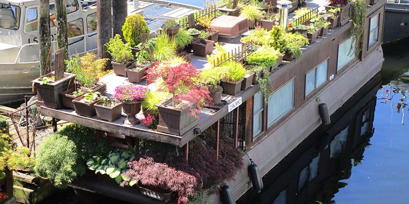 On a day of sunshine, showers and angry skies, we alighted from the ferry at Langdale on Howe Sound and made the short road journey on Highway 101 to lovely Gibsons Landing. This quaint little town, with stunning views across Howe Sound, has a busy working harbour, pier and a plethora of boats and yachts – including permanently moored houseboats covered in pots of colourful flowers.