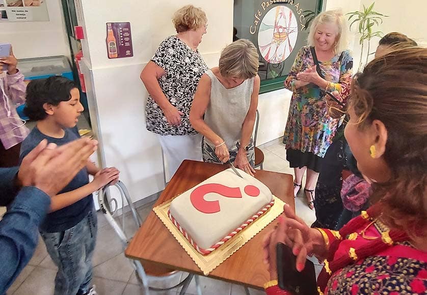 Following the service, coffee and cake were served in the local café, the cake featuring a huge red question mark, the logo for Alpha.