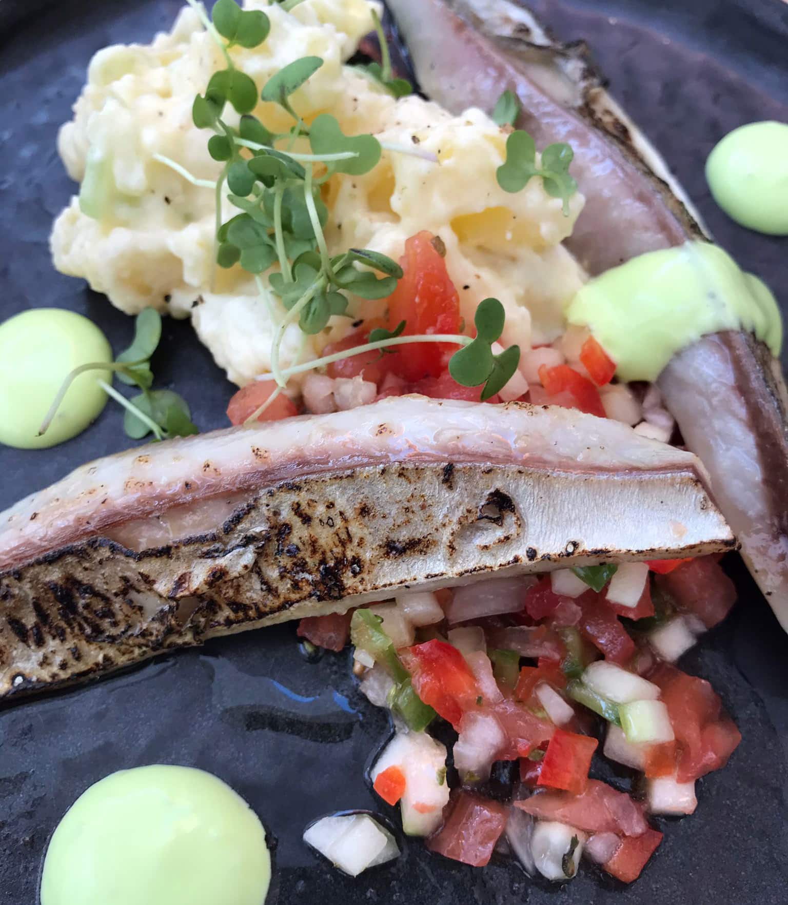 Once the group was seated, Sommelier Victor D’Avó began to unveil the journey through his chosen wines starting with Murganheira Super Reserve Brut 2015 to accompany the first dish of mackerel fillet on potato and celery salad.