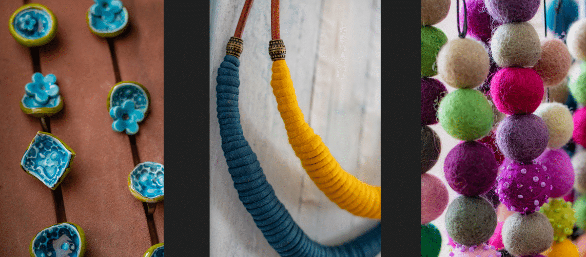 Susanne Drohla is the most recent addition to the group. She specializes in two things: handmade wool bags with intricately knitted and sewn patterns; and filagree wire jewellery. Both of her specialties show a fine attention to detail and color.