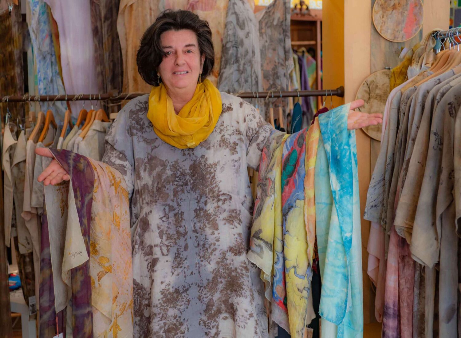 Manoli Ortiz de la Torre is a textile artist and naturalist. She started as a painter, and is now experimenting with combining plants of the Algarve hills with fabric design. Collecting leaves of olive, almond, carob, and other trees, she prepares inks to print on natural fabrics and canvases. “I live in a natural environment, and I bring nature into the fabrics,” says Manoli. She also brings this message to many students through workshops and art therapy.