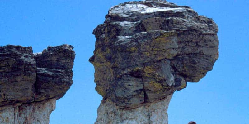 There were superb views of the Rocky Mountains in all directions. At this lofty elevation, we found it better to walk slowly as there is 35% less oxygen than at sea level! During our return journey we followed a side trail to look at the unusually-shaped ‘Mushroom Rocks’. These strange formations were formed over thousands of years as the granite ‘stem’ of the mushroom erodes faster than the schist rock that makes up the ‘cap’.