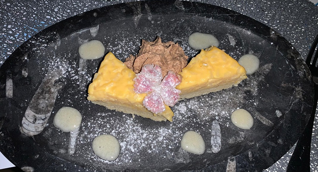 And for dessert, a “semifrio” of sweet-rice with a cinnamon mousse and lemon jelly served with a “Grandjó Meio-Doce”, a semi-sweet wine from the Douro region made from Viosinho, Moscatel and Gewürztraminer grapes.