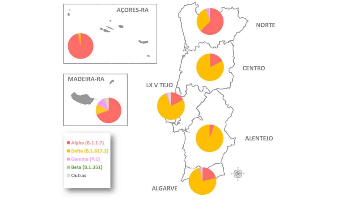 In the Algarve, the Delta variant has completely overshadowed the Alpha (Kent) variant, which now only accounts for 21% of new cases.