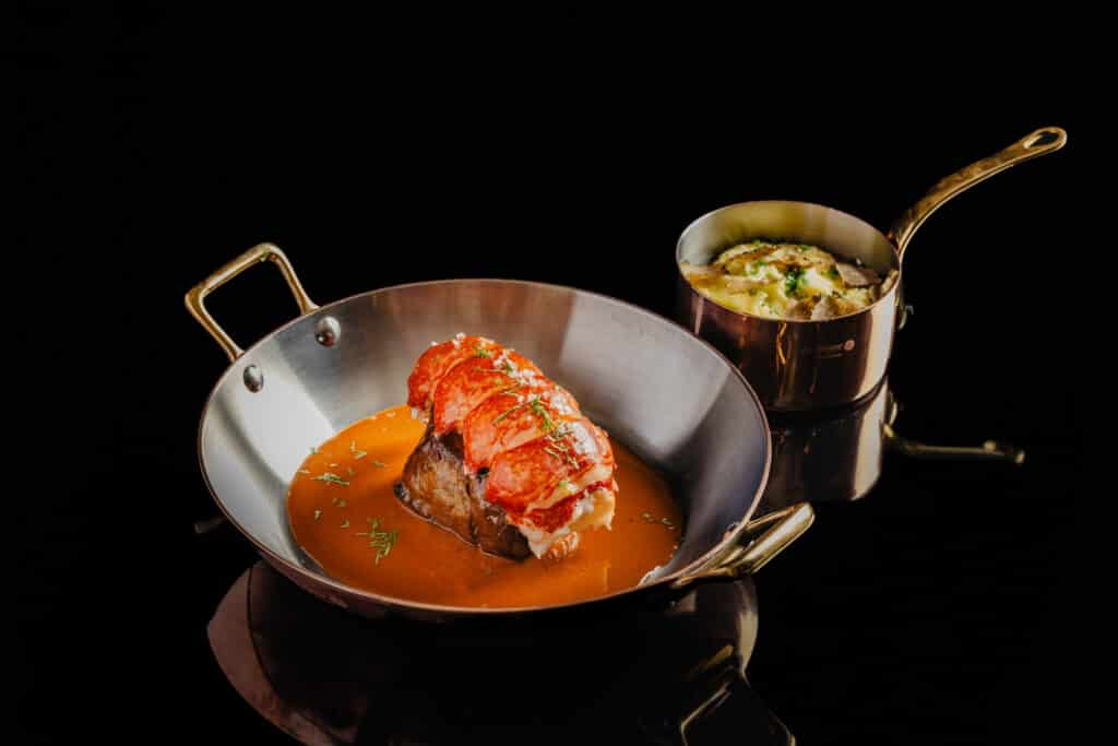 Starters include refined choices such as Oscietra caviar served with handmade blinis, crème fraîche and chopped egg. The main courses bring together premium ingredients and polished techniques, including fresh lobster with cauliflower purée and citrus notes, turbot with champagne sauce and beef loin with truffle and Mourillos Jus.