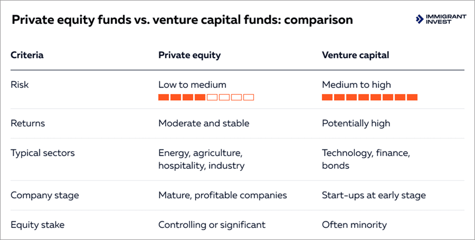 Types of funds. Applicants for the Portugal Golden Visa can invest in regulated venture capital or private equity funds. Venture capital typically supports early-stage startups, whereas private equity invests in more established companies.