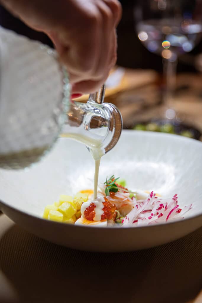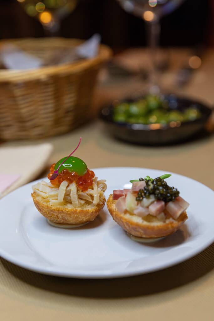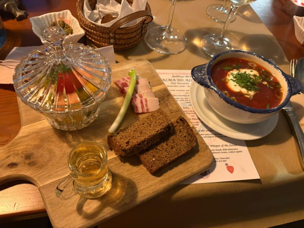The evening began with a glass or two of sparkling wine, after which the five-course dinner was served. This started with Kolobok (two small delicate Berliner topped with smoked sturgeon and caviar), followed by Okroshka (a subtle soup of fresh herbs and king-crab from Murmansk), a traditional Borscht (a beetroot potage served with homemade salo bacon and pickles, rye bread and a shot of vodka), a main dish of silky beef tongue with a morel demi-glace and a slice of foie-gras, and to finish, an amazing porcini ice-cream with sweet-salted cream and marinated apple.