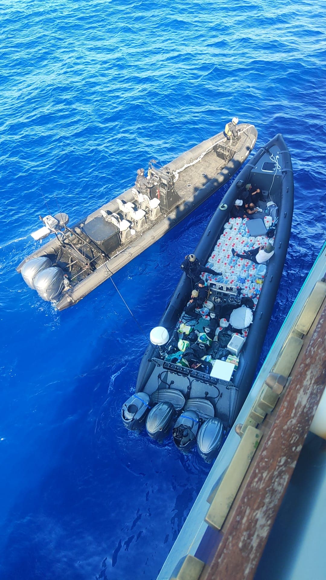 All three boats were eventually apprehended, and towed back to the mainland (image above). They had on board more than 100 jerrycans of fuel – and were crewed by 11 men: seven Spaniards, four Moroccans.