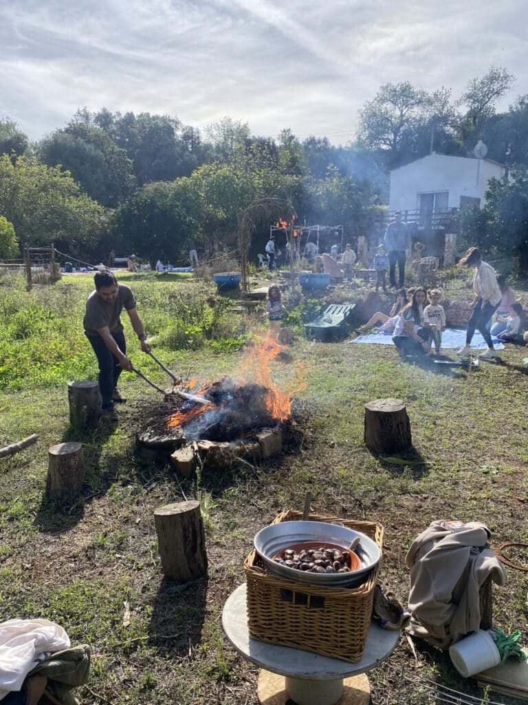 One recent autumn gathering in Querença combined a countryside walk with a shared picnic, creative activities and storytelling around a fire.