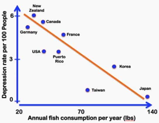 A deficiency in omega 3 is associated with the onset of depression. All studies agree that the less you consume omega 3, the higher the risk of having depression. There is indeed an inversely proportional relationship between these two parameters (see figure 1).