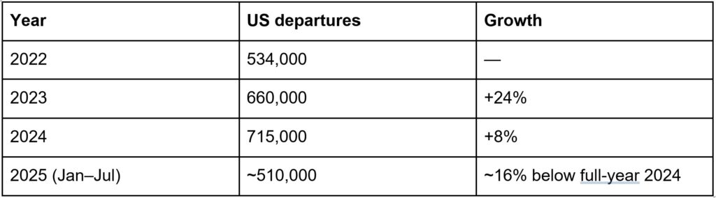If that pace holds, 2025 should close between 740,000 and 770,000 travelers – another modest rise of 4-8%. For 2026, projections hover around 800-835,000, or a 2-6% gain.
