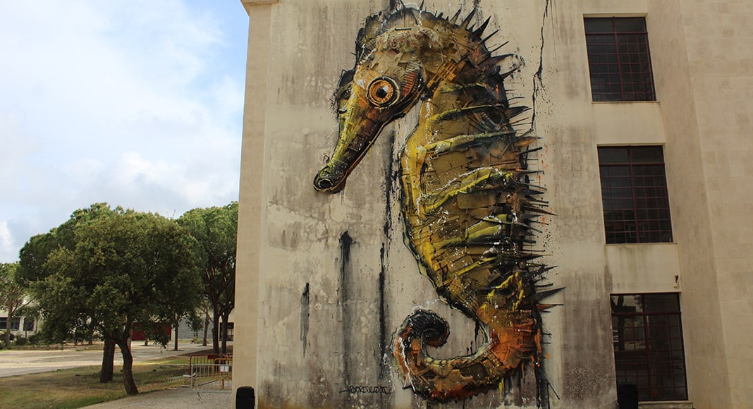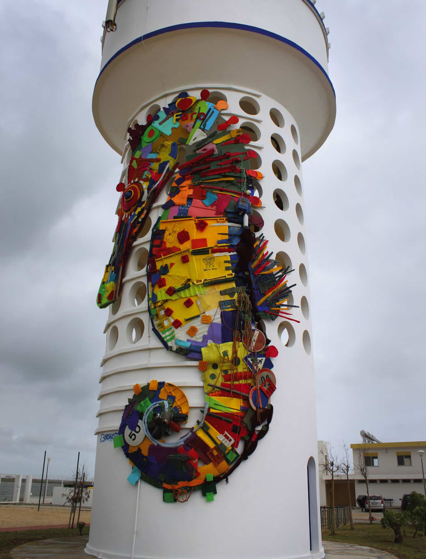 Working to raise awareness about this environmental problem, artist Bordalo II sculpted two giant seahorses using recyclable waste in Faro