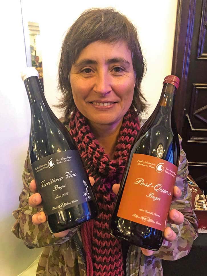 Her 2017 Post-Quer..s Baga red is testament to the unique qualities of claypot ageing; in this case, the wine is aged in small unlined pots allowing for considerable micro-oxygenation. This is a Baga of considerable concentration that would normally need at least a few years of bottle-ageing before becoming approachable, but the tannins are rounded and supple whilst the wine displays great freshness – absolutely delicious. Filipa is pictured here with this wine and another recent launch, Território Vivo, more of a traditional-style Baga, also outstanding, fermented and aged in a huge used oak “tonel” barrel.