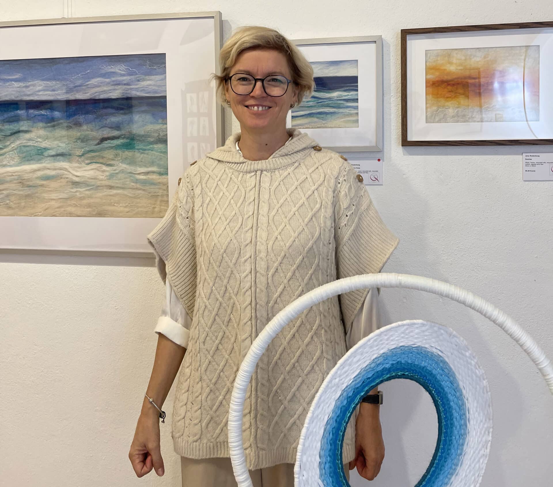 With a father from Viana do Castelo, Jane Rodenburg always had roots in Portugal, but it was in the Algarve that she felt at home. “Everything is wonderful, the people, the weather, the beach, the gastronomy and the sense of security. I’ve travelled a lot and lived in the Caribbean, in Australia, but in Europe I feel there’s a connection to something greater,” she says. After working several years as a teacher, it was a boat trip across the Atlantic Ocean that set the tone for Jane’s work. “Something awakened in me when I was on the boat, watching the wind hit the sails. I like the feeling of being totally immersed in the moment and feeling something inside that is then transferred to the outside. I am always very fascinated by the horizon, the feeling of being calmly here, in the present, and there is simply something about the sea that connects with me.” Hence her focus on blue tones and the abstract through natural fibres, mainly wool, silk, and some recycled materials. From a distance and at first glance, Jane’s pieces may look like watercolour paintings thanks to the precision with which she combines the materials.
