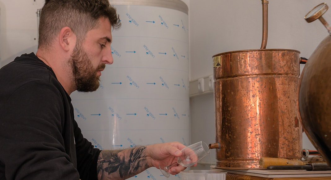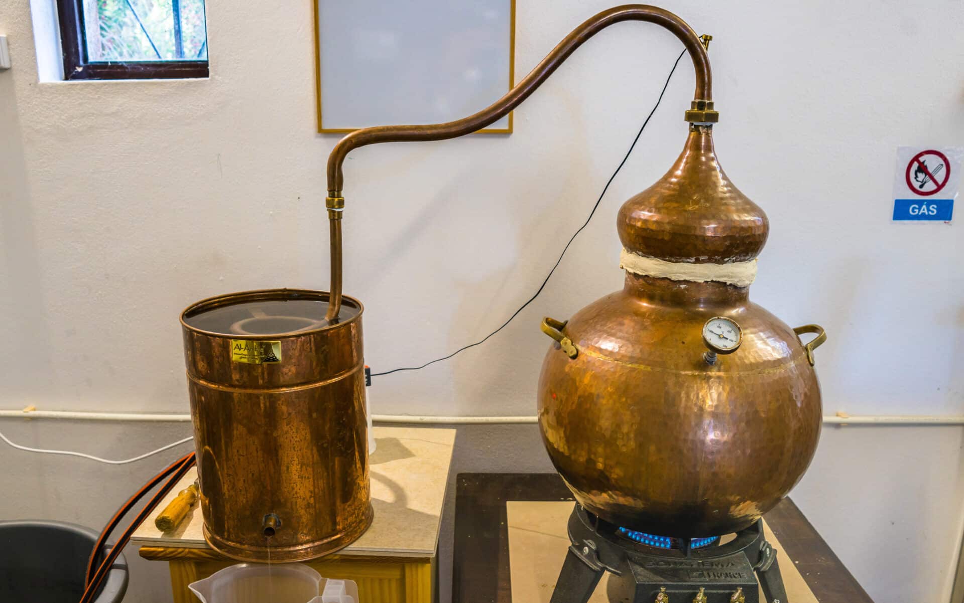 The three entrepreneurs chose to use a traditional copper pot called the “alembic still”, which was developed in 800 AD. Derived from the Arab word “al-aniq”, meaning “still” or “that which refines”, alembic is a technique also used to make essential oils and very similar to the way the Portuguese make their beloved Medronho firewater.