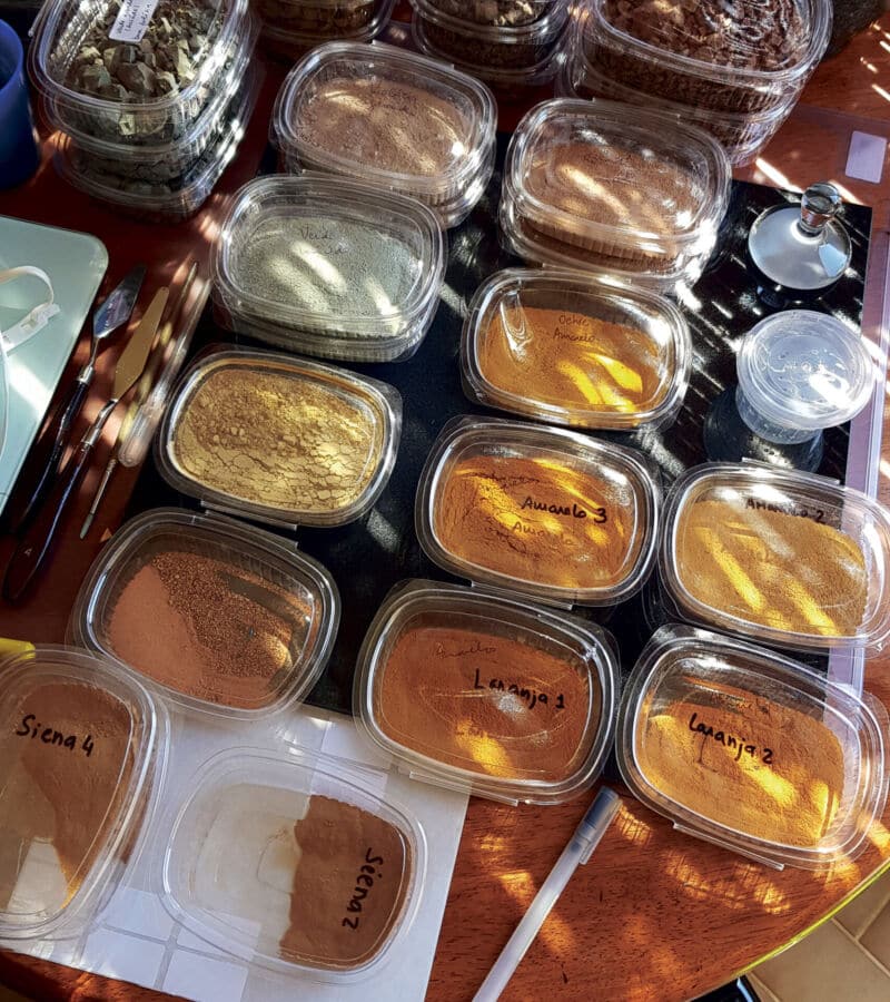 “We test (throughout the process) and see how the pigment reacts. First, we make the mixture with a spatula and then use a glass pestle to work the pigment against another flat surface. The continuous friction makes the grains separate even more. Then we test the texture on paper to see the proportion of binder and pigment. Afterwards we fill the mixing palettes and wait a week or two and then refill them. Sometimes we have to repeat the process two to three times.”
