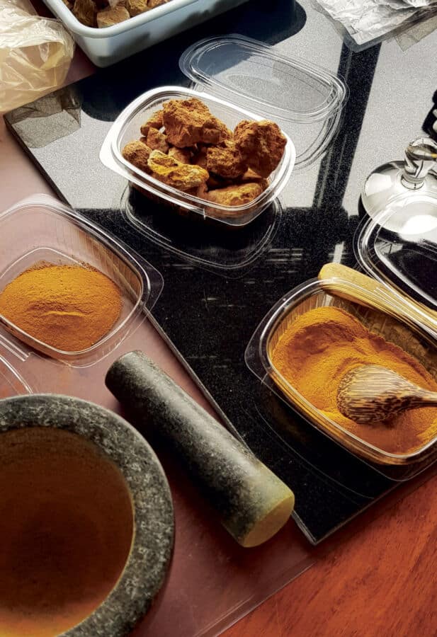 All paint has a binding element. In the case of Sarita’s watercolours, Arabic gum – a natural resin obtained from the acacia tree – is used to bring all the elements together. When it is sold in bulk, the gum comes in the shape of resin stones, which can then also be ground.