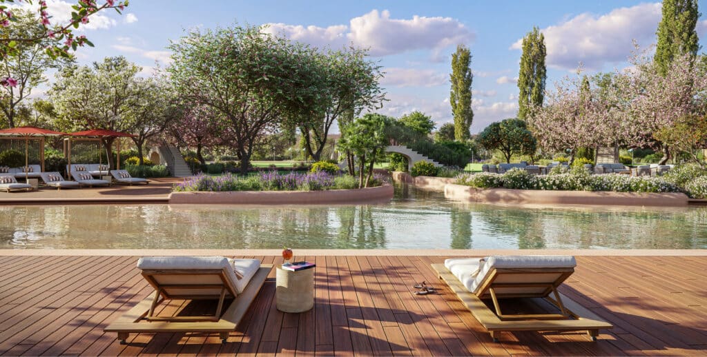 Beyond the residences, the project includes a country club with a restaurant, a gym, an indoor swimming pool, a spa, and tennis courts. A standout feature, and a unique element in the Algarve, is a lazy river designed for family leisure.