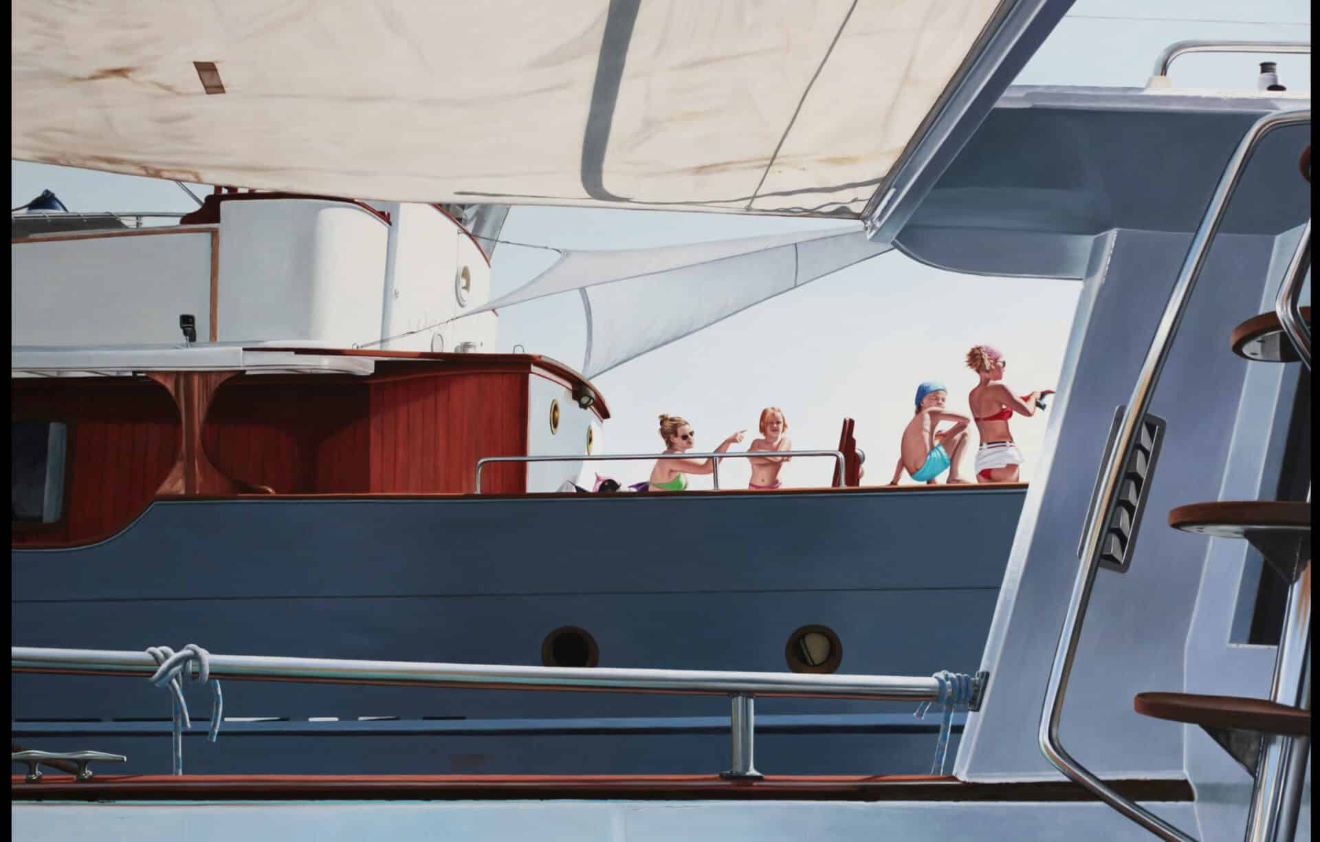 What interests Fernandes is the imagined moment that does not exist, that is not real but is created and captured in painstaking minutiae. In this Instagram era, with filtered sunsets and selfies, what we have here is a heightened reality. The fact that we are looking at a painting is never called into question. The image is crisp, the palette saturated and the composition carefully controlled.