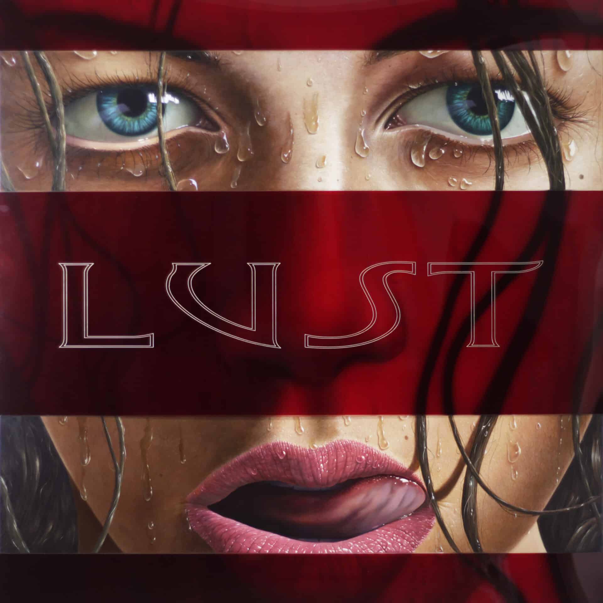 The scenes in his works go ‘beyond realism’, they are, as you might say, picture-perfect. It could be an image from a travel brochure for the Maldives, a glossy magazine shoot or a post from an influencer. In fact, there is a knowing seduction taking place as Fernandes plays upon the sexy allure of his subjects and the attraction of the locale. The women are coquettish with a come-hither look. This effect is heightened when the artist incorporates phosphorescence paint into the text over the work, making the nocturnal viewing of a painting like ‘Lust’ strangely transformative.
